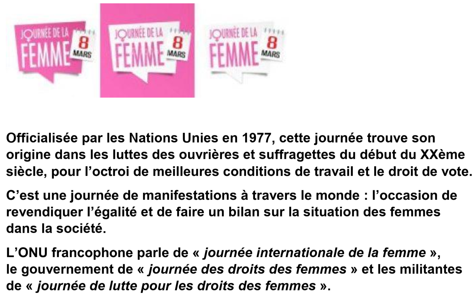 Chaque année, la journée internationale des droits des femmes est l’occasion de remettre sous les projecteurs les nombreuses inégalités dont sont encore victimes les femmes par rapport aux hommes, chiffres à l’appui. Le salaire mensuel net moyen des femmes en France était , selon l’INSEE, fin 2019, de 16,8 % inférieur à celui des hommes. Les militantes des droits des femmes dénoncent aussi les violences faites aux femmes et les féminicides: En 2024, 107 femmes ont été tuées par leur conjoint ou ex-compagnon.