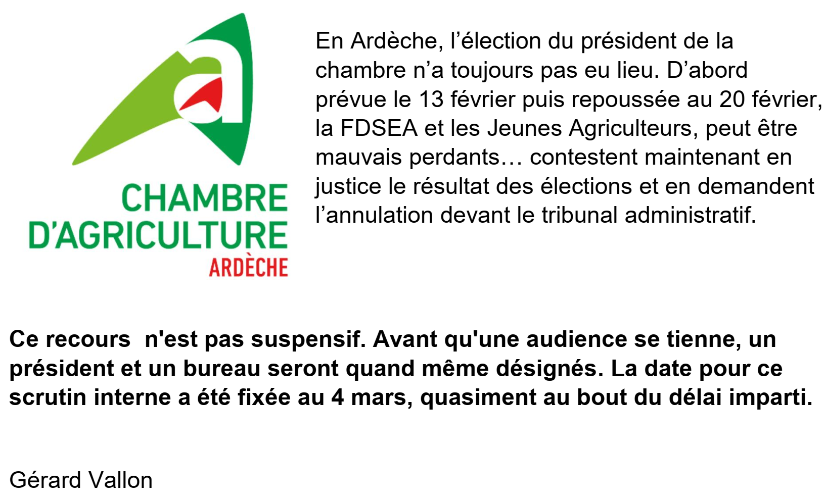 l Ardèche est donc le seul département en France à être représenté par la confédération paysanne. A l’heure ou la filière agricole est au plus mal malgré la pommade distillée au salon de l’agriculture pour camoufler une crise de longue date ,