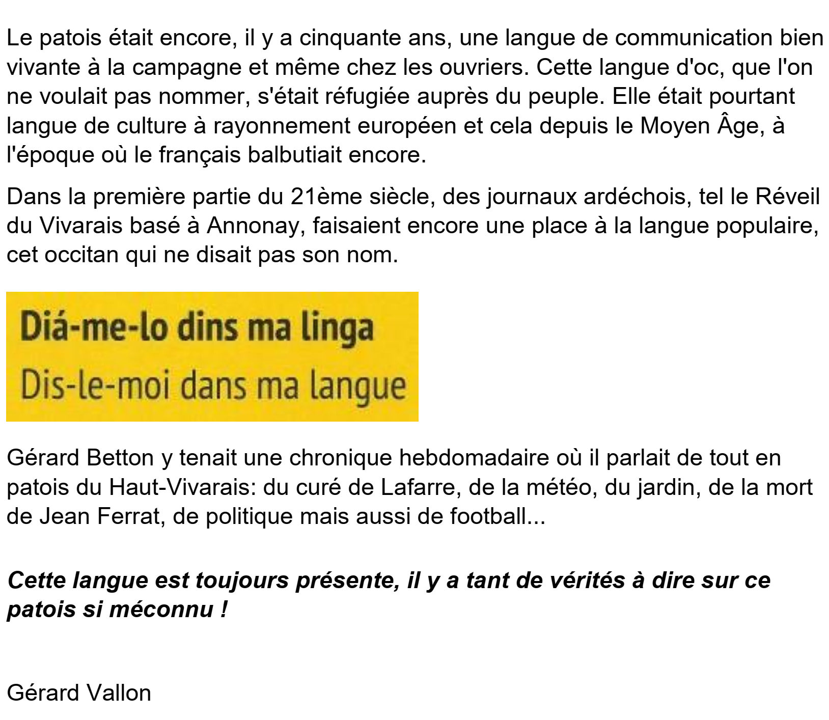 On en avait parlé…bien souvent…de « cours » de patois. Attendant le déclic, afin de ne pas laisser disparaître ce patrimoine, une première réunion de présentation se tiendra le 19 décembre 2024 à 15h au centre culturel de Lamastre avec Jean-Claude COURTIAL historien.
