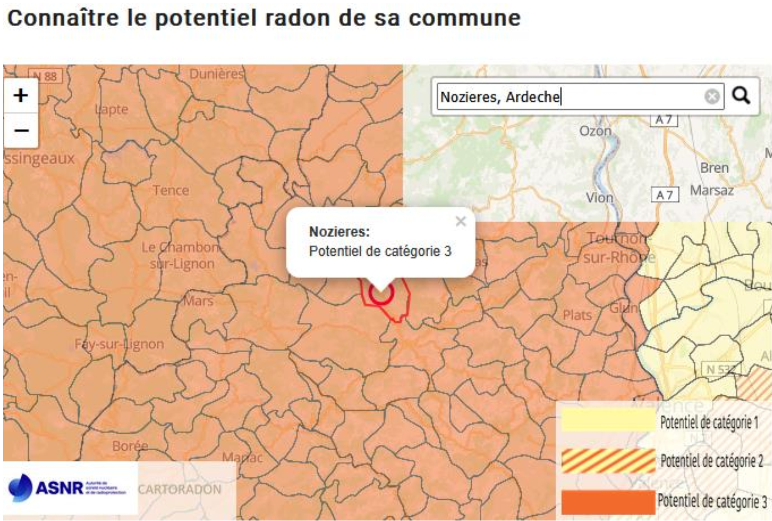En Ardèche, 238 communes sur 335 sont répertoriées, Nozières est dans le secteur de la zone concernée par la présence du gaz radon à un niveau 3.