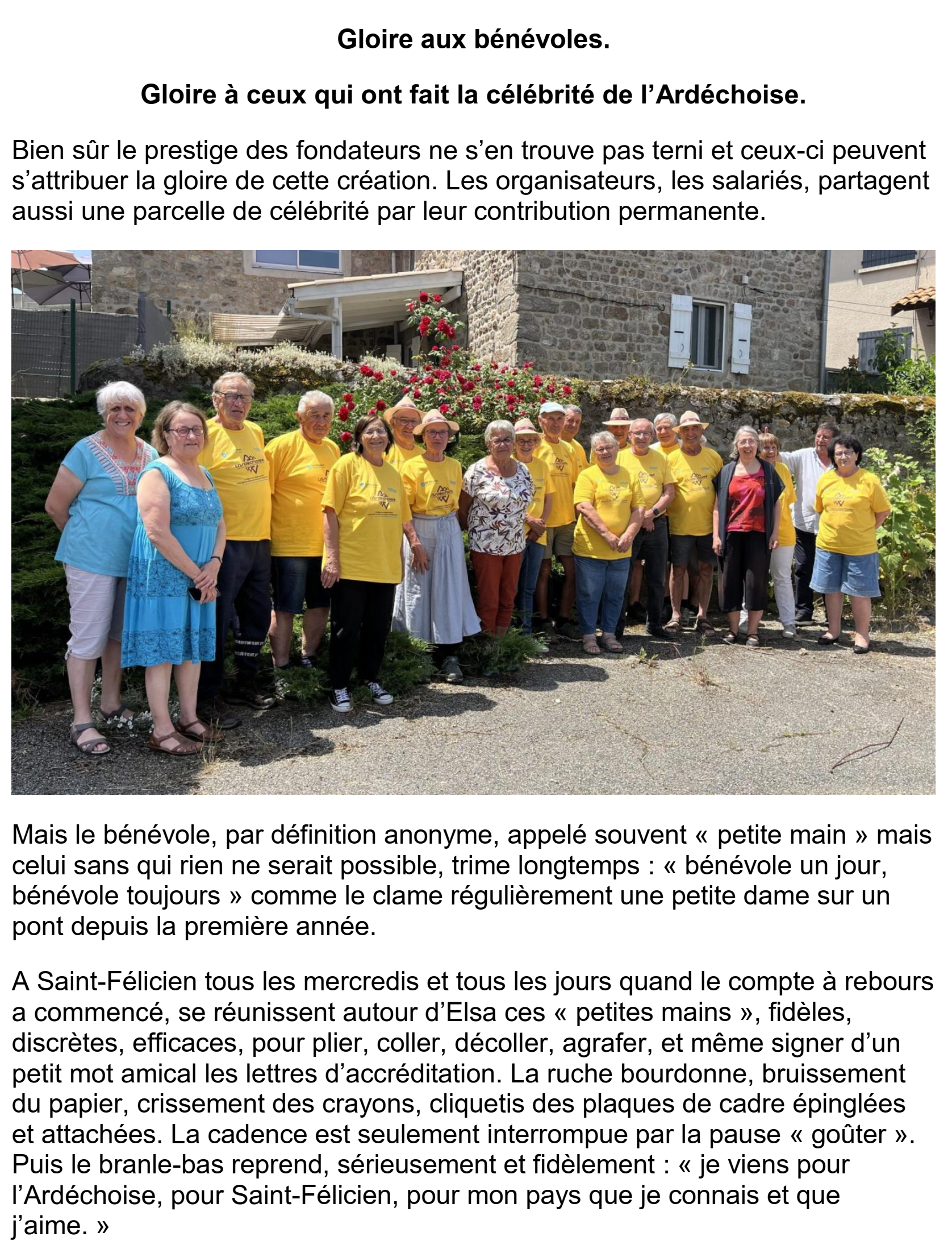 Je ne développerai pas cette deuxième période. Mais il serait triste de clore sur une perspective moins merveilleuse mais légendaire, sans ouvrir un dernier chapitre sur ceux qui ont fait la légende et la gloire de l’Ardéchoise : les bénévoles.