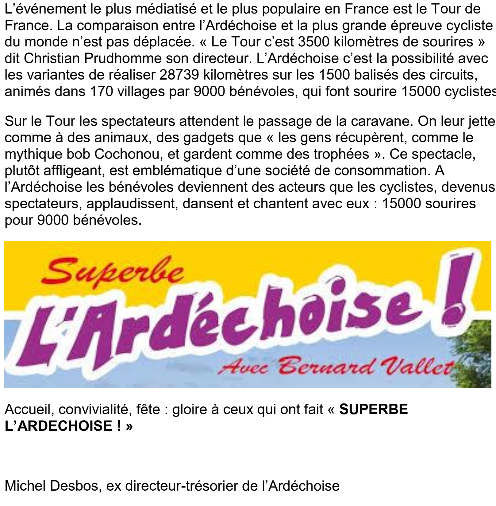 1. Pour clore cette saga très largement suivie, rappelons que Noz’infos a une longue histoire avec l’Ardéchoise: nombre de ses membres sont ou ont été bénévoles de l’épreuve et ce n’est pas moins de 76 articles en 10 ans que le site a consacré à la cyclosportive.