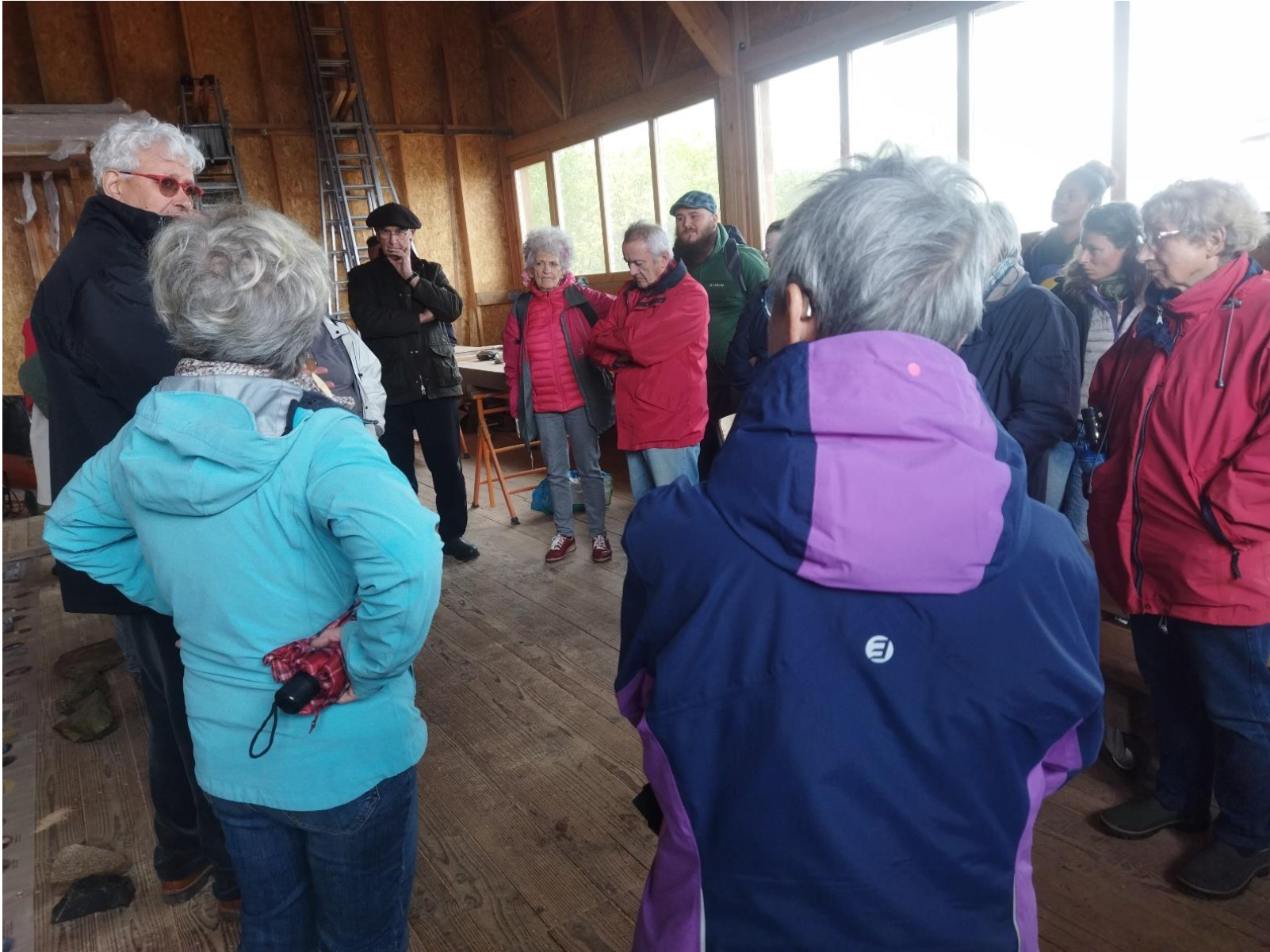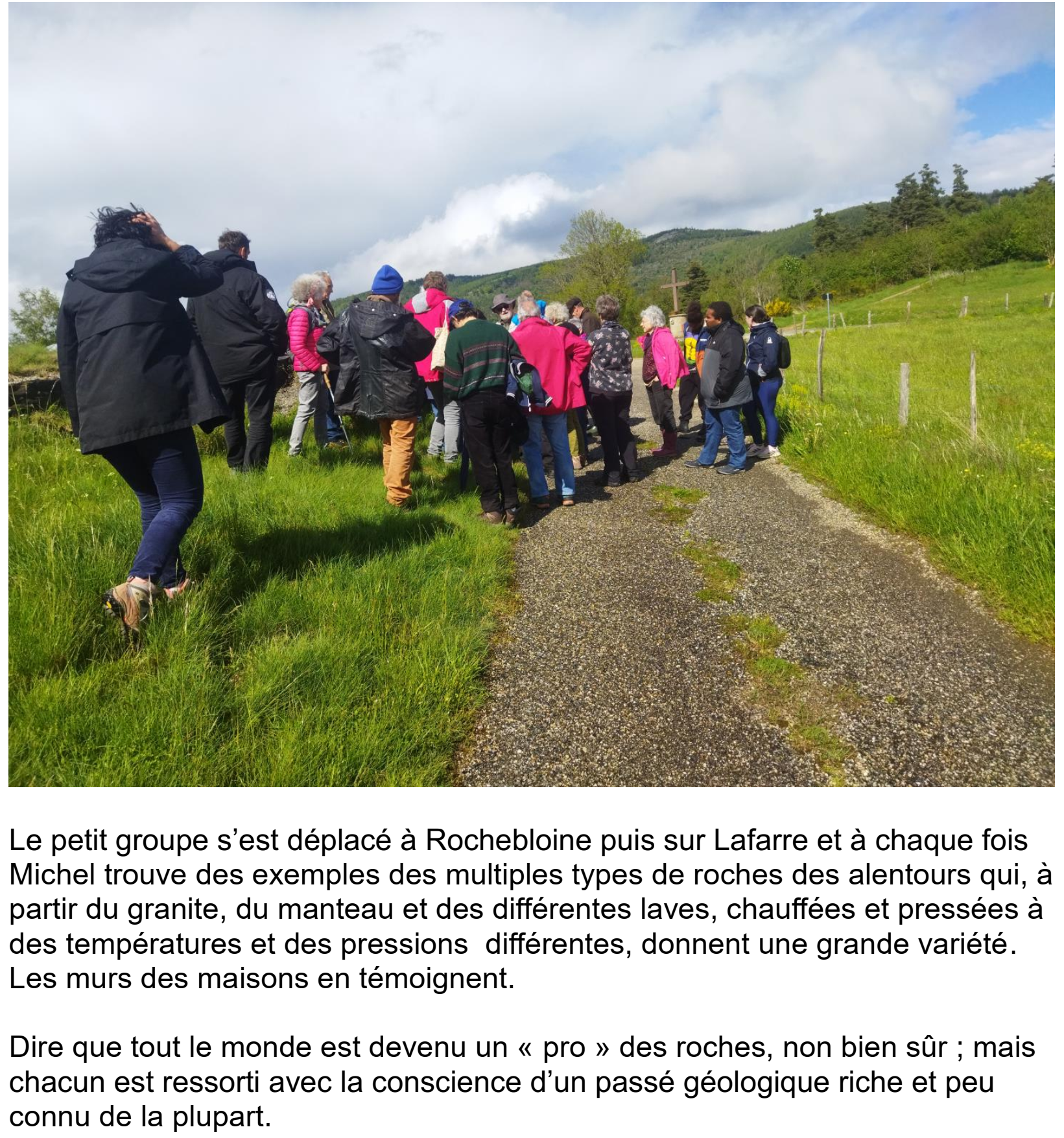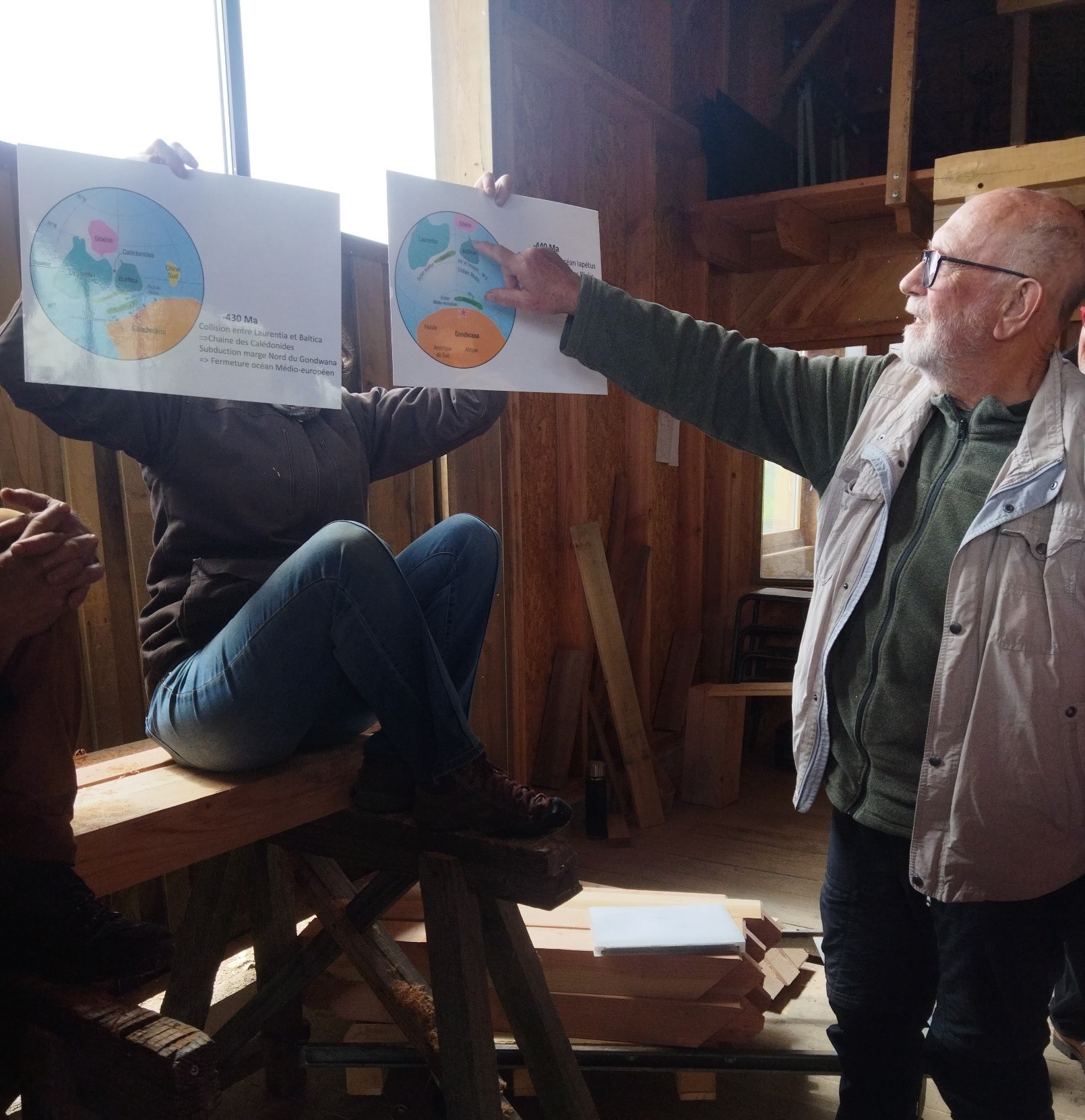 Michel Beurrier, notre géologue, avait prévu un petit topo en salle: Marine, la Charpentière, nous a ouvert les portes de son atelier fleurant bon le bois et Richard, le paysan géologue, a apporté sa collection de « cailloux » sur lesquels peu à peu nous allons porter un autre regard car toutes ces roches ont entre 300 et 550 millions d’années et ont traversé des événements que nous n’imaginions pas. Total respect !
