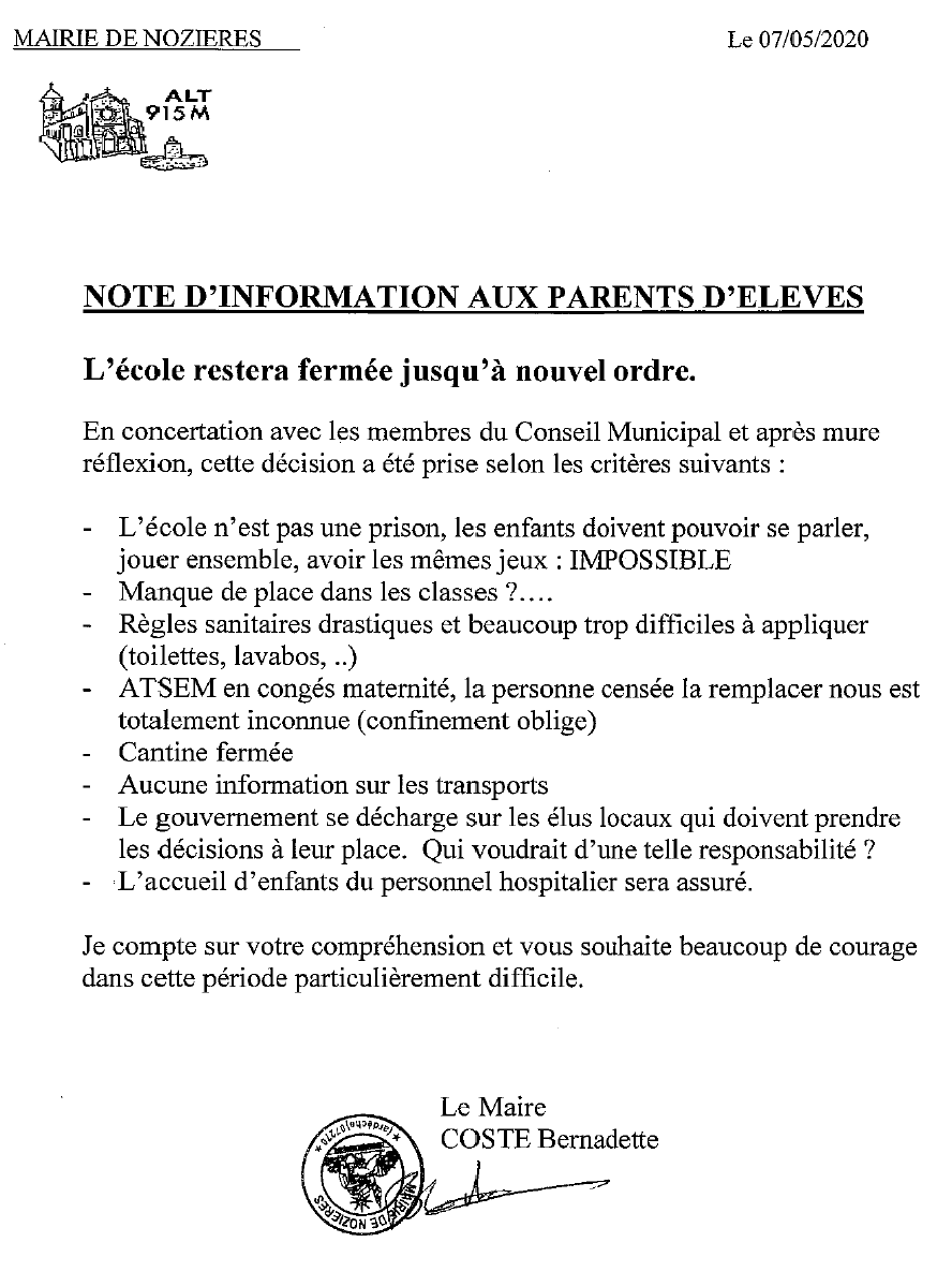 Ci-dessous la note d’information du maire aux parents d’élèves