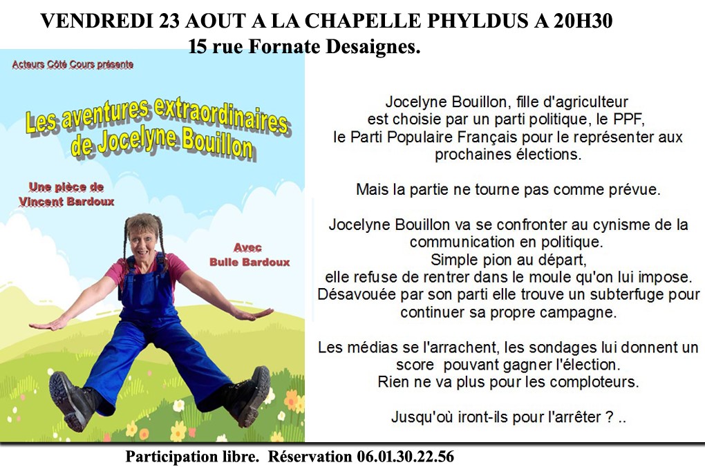 « Les aventures extraordinaires de Jocelyne Bouillon » – Théâtre à Désaignes le 23 août à la Chapelle Phyldus