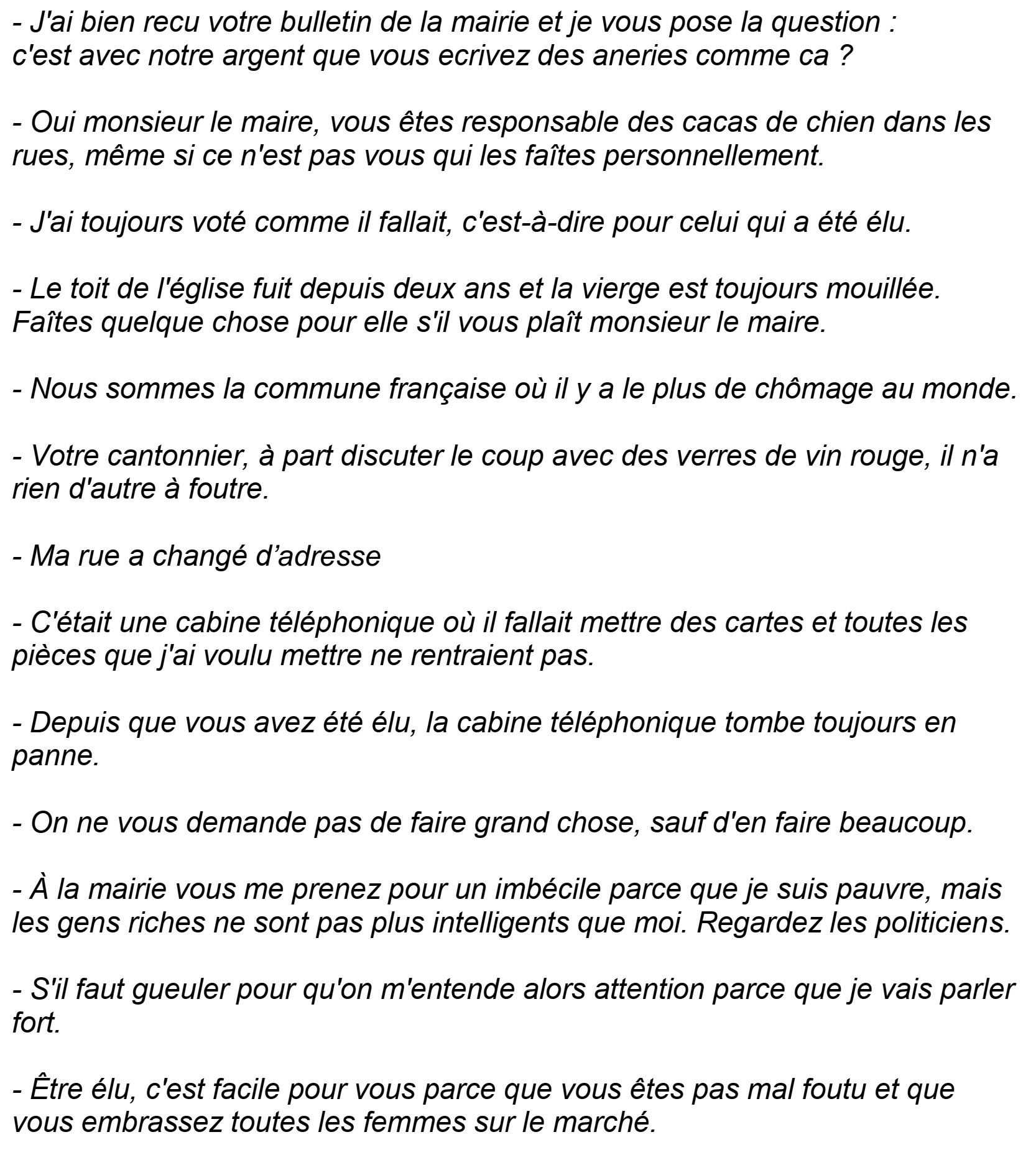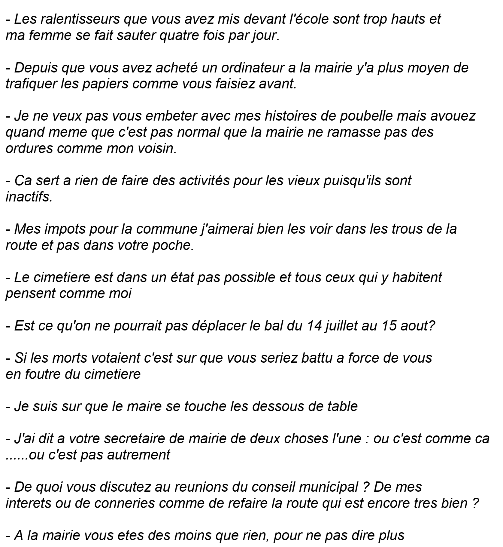 Les élections municipales approchent et à cette occasion, voici relevées, fautes d’orthographe incluses, des lettres souvent anonymes, reçues dans différentes mairies de France. La mairie de Nozières doit elle aussi en posséder une collection…