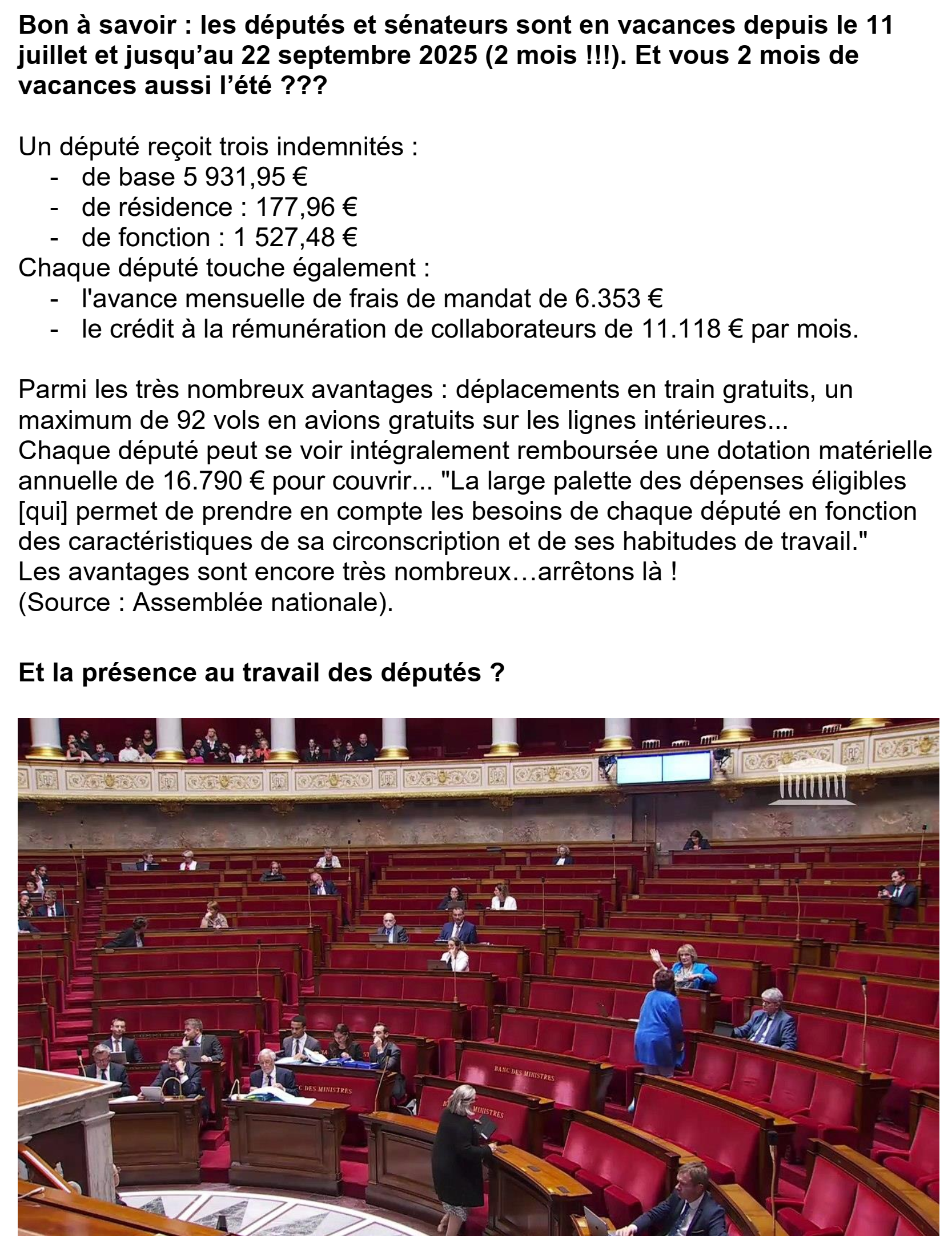 Si la France bat le record de prélèvement d’impôts, elle bat aussi le record du nombre d’élus. Beaucoup sont inutiles et servent la soupe. Ils coûtent cher et bénéficient de nombreux privilèges. Un maire qui est aussi président de communauté de communes, vice président de syndicat mixte, conseiller départemental et/ou régional gagne autant, voir plus qu’un député et on en connait… La démocratie ne se mesure pas à leur nombre et elle est bien malade ! LA COLERE GRONDE contre les élus aussi.
